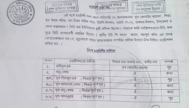 দেশে থাকা একমাত্র মেয়ে খানু বেগম, তার স্বামী কালা বদা ও সন্তানরা ৪/৫ বছর পূর্বে লোভের বশবর্তী হয়ে পাকিস্তানে বসবাসরত পাঁচ ভাই বোনের মধ্যে একমাত্র হামিদুল হককে জীবিত এবং অপর তিন ভাই দুই বোনকে পিতার পূর্বে অবিবাহিত অবস্থায় মৃত্যু বরণ করেছে মর্মে মিথ্যা তথ্য দিয়ে স্হানীয় ইউ পি চেয়ারম্যানের কাছ থেকে ওয়ারিশ সনদ গ্রহণ করে। এরপর ঐ ওয়ারিশ সনদ অনুবলে তাদের অংশের জায়গাসহ খানু বেগমের নামে জালিয়াতির আশ্রয় নিয়ে খতিয়ান সৃজন করে ফেলে।