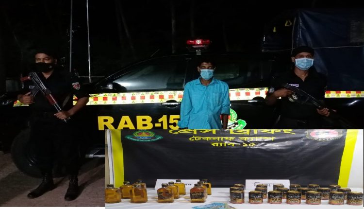 এসময় র্যাবের উপস্থিতি টের পেয়ে পালিয়ে যাওয়ার সময় পশ্চিম মহেশখালীয়া পাড়ার মৃত আবুল হোসেনের ছেলে আয়াজ উদ্দিন (৪০) কে ১টি প্লাস্টিকের বস্তাসহ আটক করে। পরে উপস্থিত লোকজনের সম্মুখে বস্তাটি তল্লাশী চালিয়ে ১৯ক্যান ডায়াবøু বিয়ার এবং ১০ বোতল গ্র্যান্ড রয়েল মদ উদ্ধার করে।
