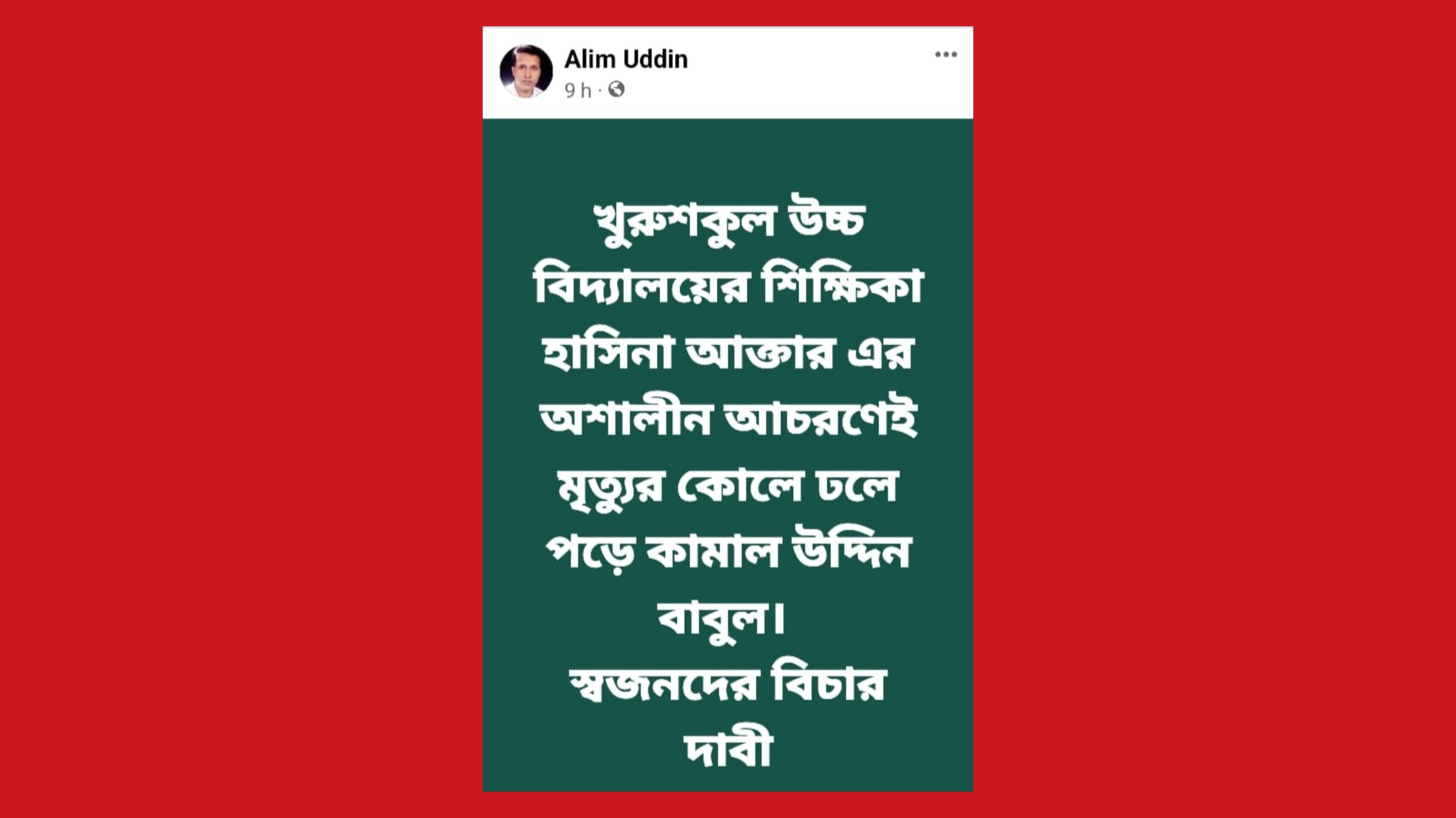 তারা বলেন, কামাল উদ্দিন বাবুলের মৃত্যুতে আমরা শোকাহত। তার আত্মার মাগফিরাত কামনা করছি। কিন্তু মৃত্যুর ঘটনায় শিক্ষক হাছিনা আক্তারকে জড়িয়ে আলিম উদ্দিন নামক (ফকিরপাড়ার বাসিন্দা) ব্যক্তি তার ফেসবুকে স্ট্যাটাস লিখেছেন। অনলাইন নিউজ করেছেন। প্রচারিত সংবাদ সম্পূর্ণ উদ্দেশ্যপ্রণোদিত, মিথ্যা, বানোয়াট ও ভিত্তিহীন। এমন সংবাদ খুবই দুঃখজনক ও একজন শিক্ষকের চরম মানহানিকর।