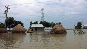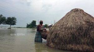 ‘খাটের ওপর পানি উঠে গেছে। রান্নাঘর-চুলা সবই পানির নিচে। তিন দিন ধরে ভাত খাইনি। শুকনো খাবার খেয়ে দিন কাটাচ্ছি। কয়েক রাত ধরে ঘুমাতেও পারছি না। শিশু সন্তান নিয়ে অনেক কষ্টে আছি। কিছু হাস-মুরগি পালতাম, তাও বানের জলে ভেসে গেছে। এখন আল্লাহ ছাড়া আমাদের আর কেউ দেখার নেই।’